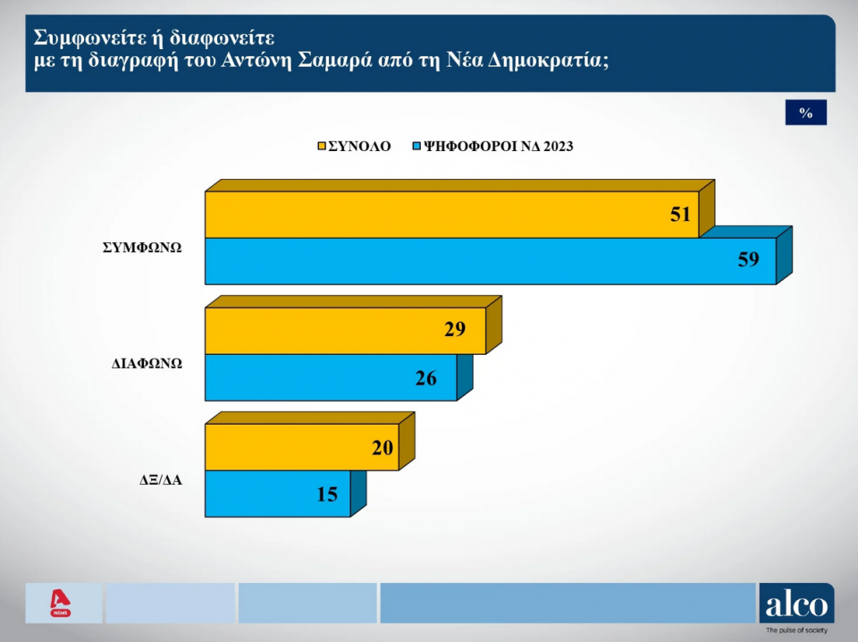 Όσον αφορά τη διαγραφή του Αντώνη Σαμαρά από τη ΝΔ σε γενικό πλαίσιο το 51% συμφωνεί, ενώ ακόμη μεγαλύτερο είναι το ποσοστό (59%), στους ψηφοφόρους της ΝΔ.