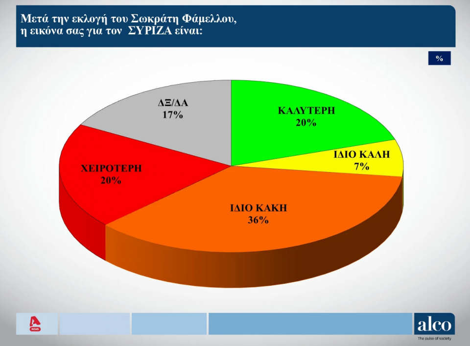 Όσον αφορά την εικόνα του ΣΥΡΙΖΑ μετά την εκλογή του Σωκράτη Φάμελλου το 36% λέει πως είναι ίδιο κακή, το 20% χειρότερη, το 20% καλύτερη και το 7% το ίδιο καλή.