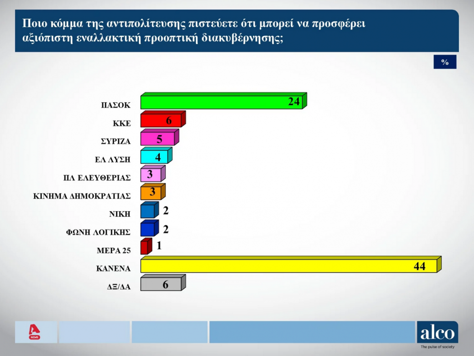 Το ΠΑΣΟΚ ορίζει ως την πιο αξιόπιστη προοπτική διακυβέρνησης, από τα κόμματα της αντιπολίτευσης, το 24% των ερωτηθέντων. Ακολουθεί το ΚΚΕ με 6% και τρίτος βρίσκεται ο ΣΥΡΙΖΑ με 5%. Η Ελληνική Λύση καταλαμβάνει το 4%.