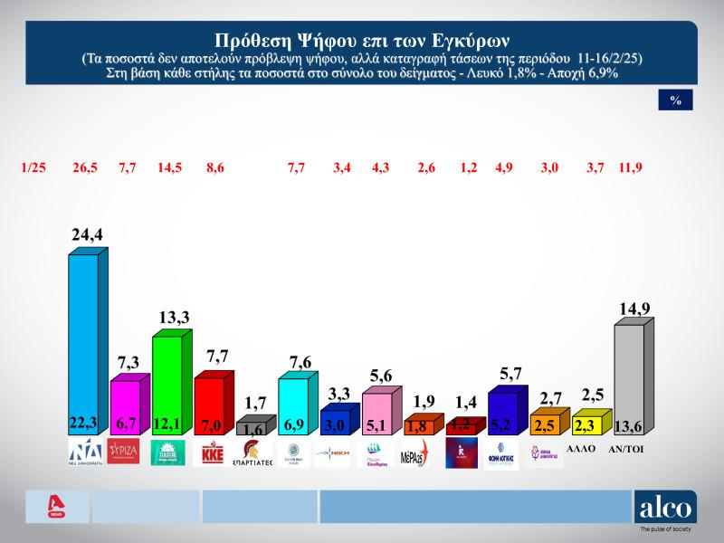 Σε ό,τι αφορά την πρόθεση ψήφου επί των εγκύρων πρώτο κόμμα παραμένει η ΝΔ συγκεντρώνοντας 24,4% (υποχωρώντας από το 26,5% στην έρευνα του Ιανουαρίου), δεύτερο κόμμα το ΠΑΣΟΚ με 13,3% (από 14,5%), τρίτο κόμμα το ΚΚΕ με 7,7% (από 8,6%), τέταρτο κόμμα η Ελληνική Λύση με 7,6% (από 7,7%) και πέμπτο κόμμα ο ΣΥΡΙΖΑ με 7,3% (από 7,7%).