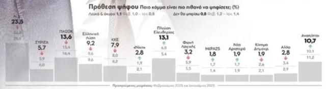 Στον αντίποδα, κατακόρυφη είναι η άνοδος της Πλεύσης Ελευθερίας, η οποία από το 5,4% τον Ιανουάριο του 2025, «χτυπάει» πλέον τη δεύτερη θέση με 13,1%. Οι επιδόσεις του κόμματος φαίνεται πως σχετίζονται ευθέως με την στάση της Ζωής Κωνσταντοπούλου σε ό,τι αφορά την υπόθεση των Τεμπών, με το μεγάλο ερώτημα να είναι πλέον αν αυτή η «εκτίναξη» θα αποκτήσει γενικότερο πολιτικό περιεχόμενο και θα ξεφύγει από το επίπεδο της διαμαρτυρίας ή, νομοτελειακά, θα... ξεφουσκώσει.