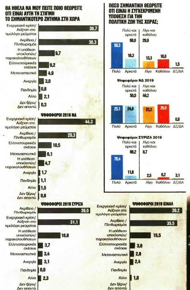 Το ζήτημα των παρακολουθήσεων βρίσκεται στην τρίτη θέση των θεμάτων που απασχολούν τους πολίτες, με την τιμή του ρεύματος και την ακρίβεια να βρίσκονται μπροστά του, ενώ ξεπέρασε τα ελληνοτουρκικά, το μεταναστευτικό και την πανδημία.