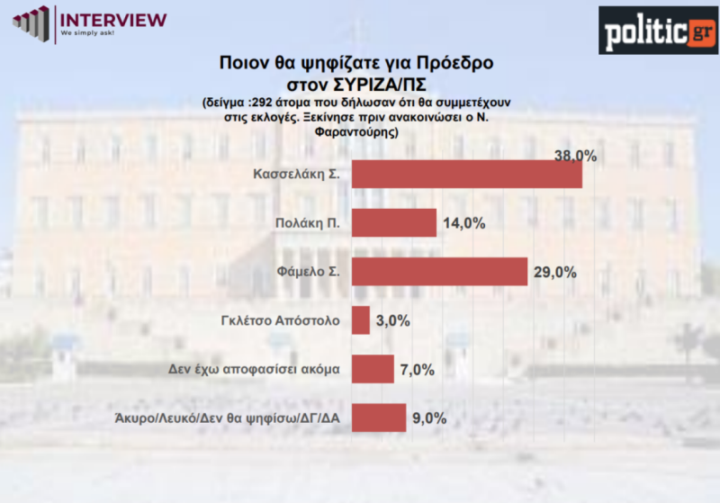 • Όσον αφορά την πρόθεση ψήφου, στο ΣΥΡΙΖΑ προηγείται ο Στέφανος Κασσελάκης (38%) και με σχεδόν δέκα μονάδες κάτω ακολουθεί ο Σωκράτης Φάμελλος (29%) (σημ. η έρευνα ξεκίνησε πριν ανακοινώσει ο Ν. Φαραντούρης). Τρίτος έρχεται ο Παύλος Πολάκης με 14%. Η ανάδειξη του προέδρου του ΠΑΣΟΚ εξελίσσεται σε αμφίρροπο αγώνα καθώς Ν. Ανδρουλάκης και Χ. Δούκας πετυχαίνουν την απόλυτη ισοψηφία (29%). Τρίτος έρχεται ο Π. Γερουλάνος με 19,2% και τέταρτη η Α. Διαμαντοπούλου με 12,6%.