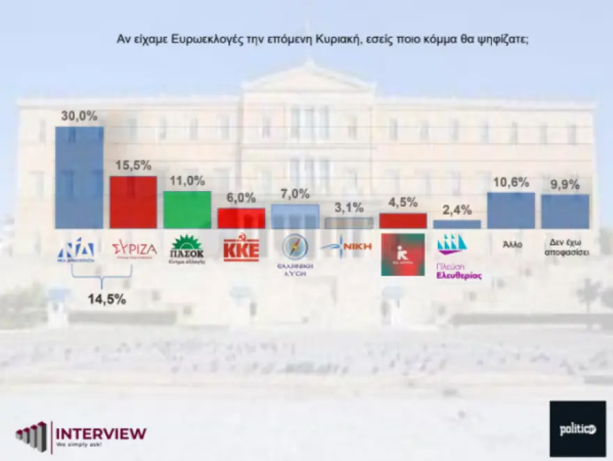 Σχεδόν διπλάσια είναι η διαφορά της Νέας Δημοκρατίας από τον ΣΥΡΙΖΑ στην πρόθεση ψήφου επί των εγκύρων στη δημοσκόπηση της εταιρείας Interview για λογαριασμό της ιστοσελίδας politic.gr ενόψει των ευρωεκλογών της 9ης Ιουνίου.