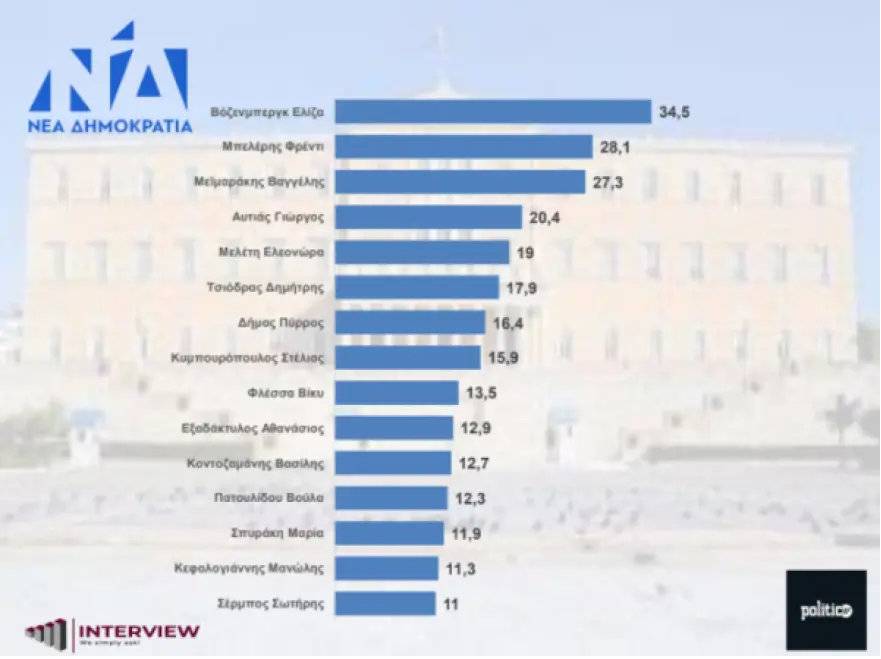 Στην ίδια δημοσκόπηση έχουν μετρηθεί και οι υποψήφιοι Ευρωβουλευτές με την κατατάξη στο ευρωψηφοδέλτιο της ΝΔ να είναι Ελίζα Βόζεμπεργκ με ποσοστό 34,5%, Φρέντι Μπελέρης (28,1%), Βαγγέλης Μεϊμαράκης (27,3%), Γιώργος Αυτιάς (20,4%), Ελεονώρα Μελέτη (19%), Δημήτρης Τσιόδρας (17,9%), Πύρρος Δήμας (16,4%) και Στέλιος Κυμπουρόπουλος (15,9%).