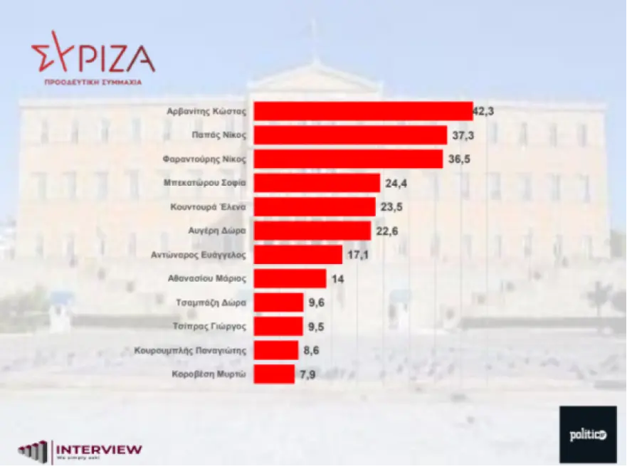 Αντίστοιχα, στον ΣΥΡΙΖΑ προηγείται ο Κώστας Αρβανίτης (42,3%) ενώ ακολουθούν ο Νίκος Παππάς (37,3%), ο Νίκος Φαραντούρης με 36,5% και η Σοφία Μπεκατώρου με 24,4%