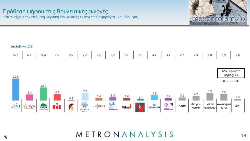 Στην εκτίμηση ψήφου η ΝΔ και το ΠΑΣΟΚ καταγράφουν τα ίδια ποσοστά σε σχέση με την αμέσως προηγούμενη μέτρηση της Metron Analysis, με το κόμμα της αξιωματικής αντιπολίτευσης να έχει την μεγαλύτερη συσπείρωση και να επικρατεί και πάλι στον χώρο του Κέντρου με διαφορά 6 μονάδων από το κυβερνών κόμμα - που εξασφαλίζει το μεγάλο προβάδισμα λόγω της απόλυτης κυριαρχίας του στον χώρο των κεντροδεξιών και δεξιών ψηφοφόρων. Το ΠΑΣΟΚ προηγείται της ΝΔ τόσο στους κεντροαριστερούς, όσο και στους αριστερούς ψηφοφόρους, αλλά με χαμηλά ποσοστά. Το προβάδισμα της ΝΔ είναι στις 11,7 μονάδες, από 11,8 στη μέτρηση του Δεκεμβρίου.