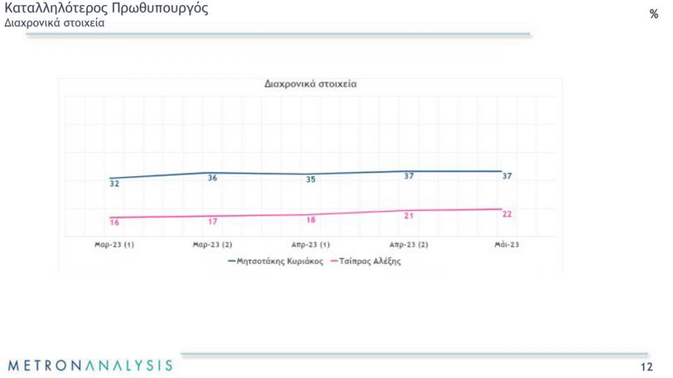 Καταλληλότερος για πρωθυπουργός εμφανίζεται ο Κ. Μητσοτάκης με 37% και ο Αλέξης Τσίπρας με 22%.