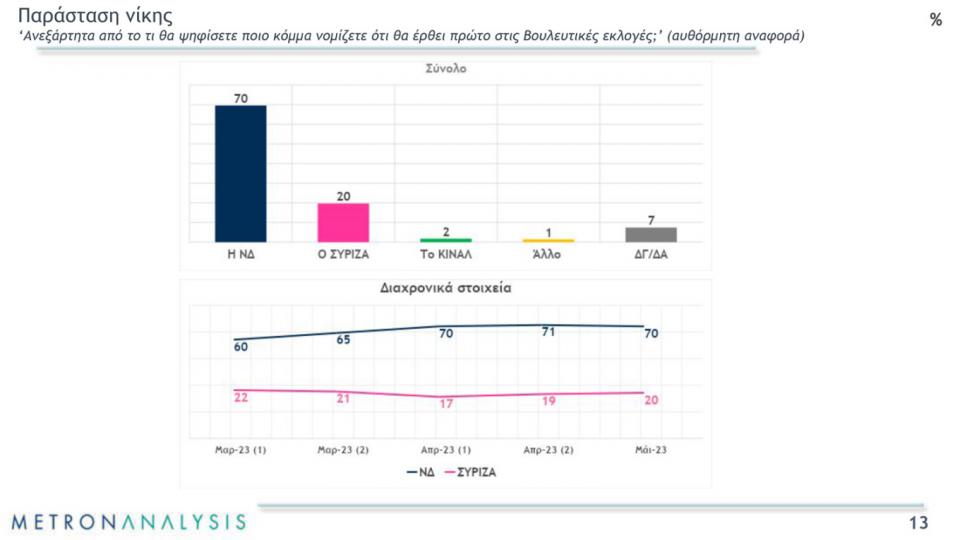 Ένα άλλο στοιχείο που δείχνει την σταθερή πρωτιά της Νέας Δημοκρατίας είναι η παράσταση νίκης. Βρίσκεται στο 70% έναντι 20% του ΣΥΡΙΖΑ και 2% του ΠΑΣΟΚ.