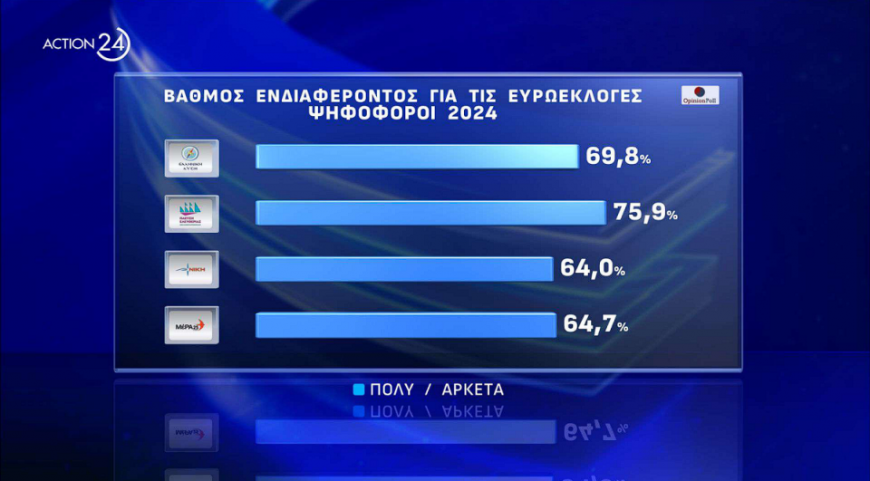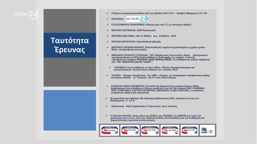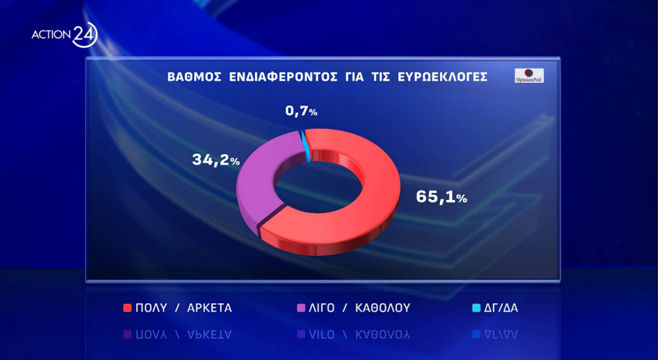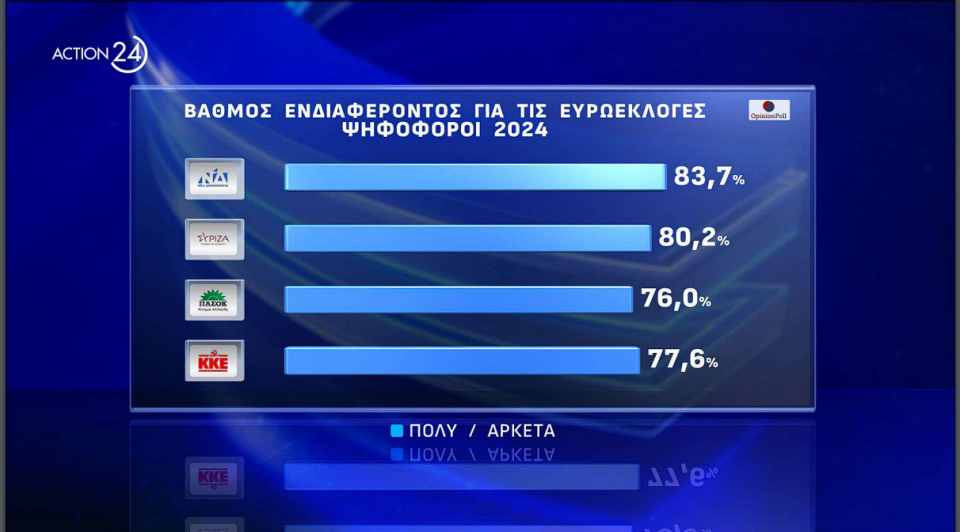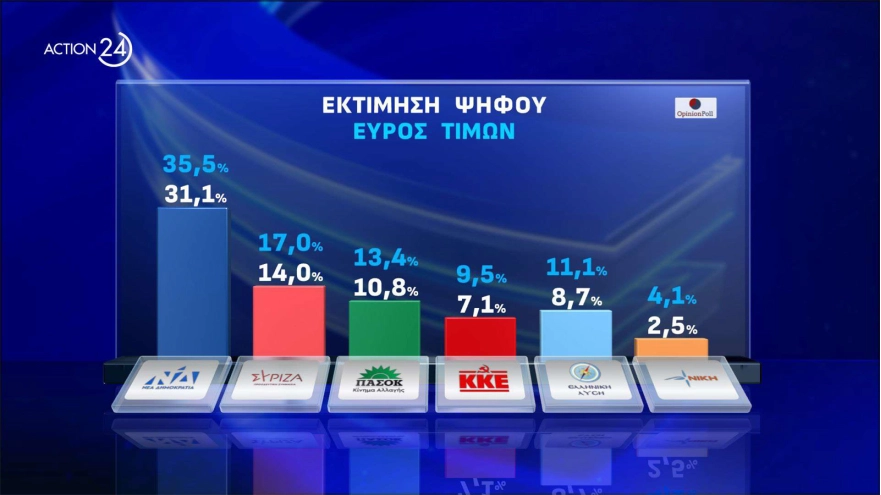 Οριακά πάνω από τα ποσοστά της των ευρωεκλογών του 2019 κατέγραψε η Opinion Poll τη Νέα Δημοκρατία στη δημοσκόπηση που παρουσιάστηκε στο κεντρικό δελτίο του Action 24 τηνΔευτέρα 20 Μαΐου. Mάλιστα, η εταιρεία δίνει άνω όριο για το κυβερνών κόμμα στο 35,5%, με τον ΣΥΡΙΖΑ να έχει άνω όριο στο 17%, δηλαδή λίγο χαμηλότερα από το ποσοστό του κόμματος στις εθνικές εκλογές του περασμένου Ιουνίου.