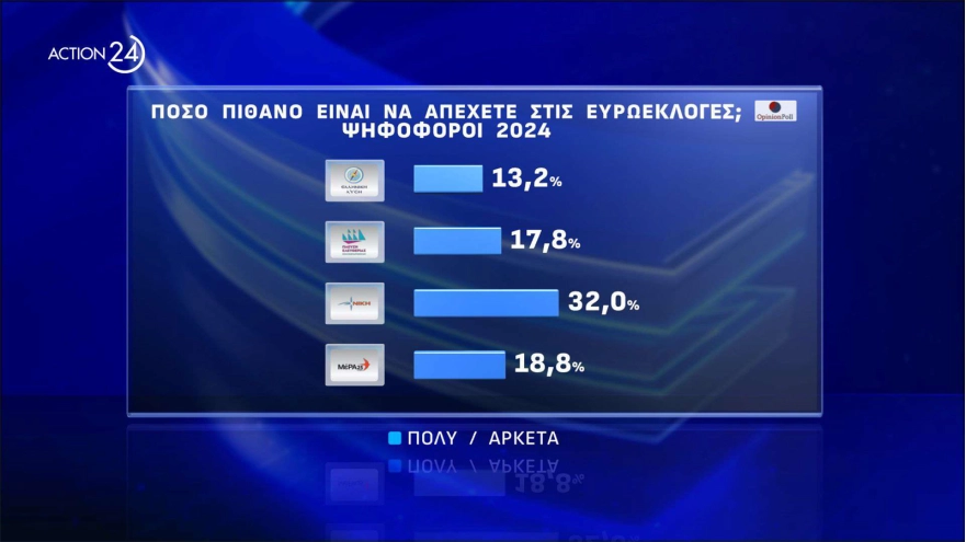 Αναλυτικά οι πίνακες της δημοσκόπησης της Οpinion Poll για το ACTION 24 που καταγράφει την πρόθεση ψήφου των πολιτών, την κατάταξη των κομμάτων και τα ποσοστά τους, χαρτογραφεί την αποχή και ακόμα πως αντιμετωπίζουν οι πολίτες τις Ευρωεκλογές, πόσοι δηλώνουν ότι είναι πιθανό να απέχουν και από ποιο κόμμα προέρχονται, έχουν ως εξής: