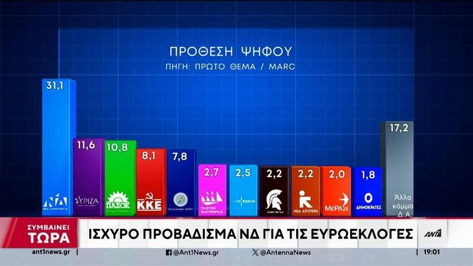 Στην δημοσκόπηση της Marc για το «Πρώτο Θέμα», στην εκτίμηση αποτελέσματος για τις ευρωεκλογές η ΝΔ συγκεντρώνει 35% και ακολουθεί ο ΣΥΡΙΖΑ με 13,5%. Το ΠΑΣΟΚ βρίσκεται στην τρίτη θέση με 12,8%. Το ΚΚΕ συγκεντρώνει 9,5%, η Ελληνική Λύση 9%, η Πλεύση Ελευθερίας 3,1%, η Νίκη 3%, οι Σπαρτιάτες 2,7% και η Νέα Αριστερά 2,7%.