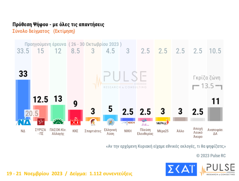 Στην πρόθεση ψήφου η πολιτική παντοδυναμία της ΝΔ επιβεβαιώνεται και σ' αυτή τη δημοσκόπηση της Pulse με το κυβερνών κόμμα να λαμβάνει ποσοστό 33%, έναντι 13% του ΠΑΣΟΚ που βρίσκεται στη δεύτερη θέση και 12,5% του ΣΥΡΙΖΑ. Το ΚΚΕ λαμβάνει 9%. Στη δημοσκόπηση του Οκτωβρίου της Pulse η ΝΔ ελάμβανε 33,5%, ο ΣΥΡΙΖΑ βρισκόταν στο 15% και ήταν δεύτερος, ενώ το ΠΑΣΟΚ ελάμβανε 12% και το ΚΚΕ 8,5%.