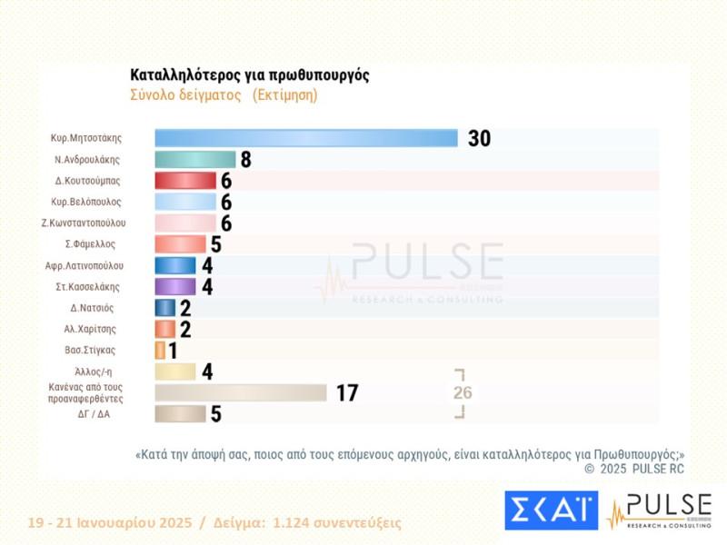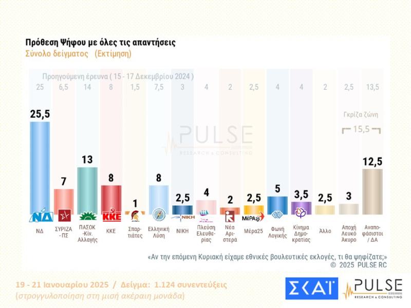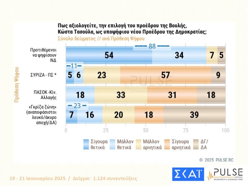 Σταθερά πρώτη εμφανίζεται η Νέα Δημοκρατία με διαφορά 14 μονάδων από το δεύτερο ΠΑΣΟΚ-ΚΙΝΑΛ, σύμφωνα με τη μεγάλη δημοσκόπηση της Pulse, η οποία διενεργήθηκε για λογαριασμό του ΣΚΑΪ και παρουσιάστηκε στο κεντρικό δελτίο ειδήσεων του σταθμού, με τη Σία Κοσιώνη. Μεταξύ άλλων, η δημοσκόπηση δείχνει ότι η πλειοψηφία βλέπει αρνητικά την επιλογή του προέδρου της Βουλής, Κώστα Τασούλα ως υποψήφιου νέου Προέδρου της Δημοκρατίας ενώ σχεδόν ένας στους τρεις βλέπει με ανησυχία τη νέα προεδρία Ντόναλντ Τραμπ στις ΗΠΑ.