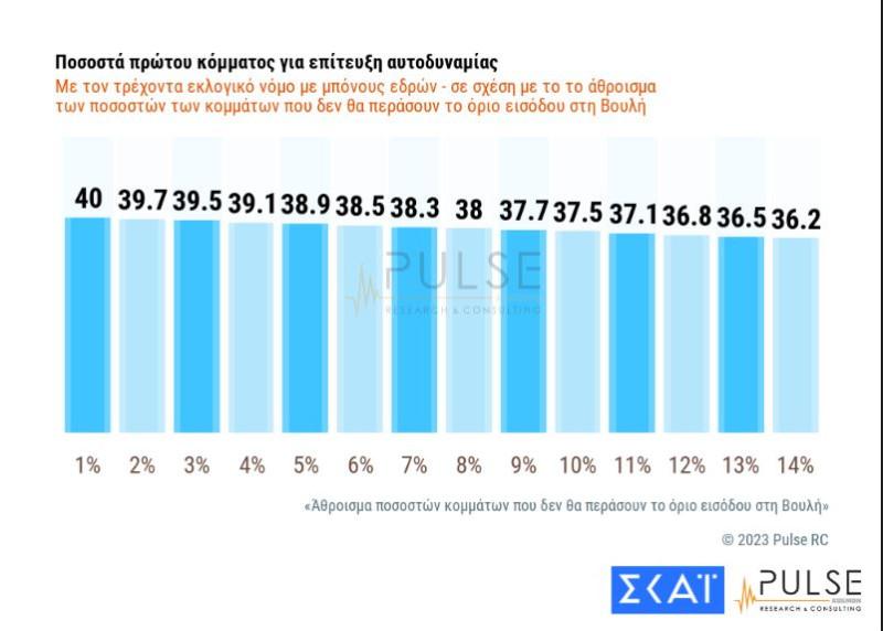 Η έρευνα της Pulse παρουσίασε όλα τα σενάρια, ακόμη και για Βουλή με εννέα κόμματα. Το βασικό σενάριο προβλέπει 7 κόμματα, ωστόσο ο κοινός παρονομαστής, σε κάθε περίπτωση, είναι η αυτοδυναμία της Νέας Δημοκρατίας, με έδρες που κυμαίνονται από 155 έως και 166, ανάλογα με τον αριθμό των κομμάτων που θα «πιάσουν» το όριο για την είσοδό τους στη Βουλή.