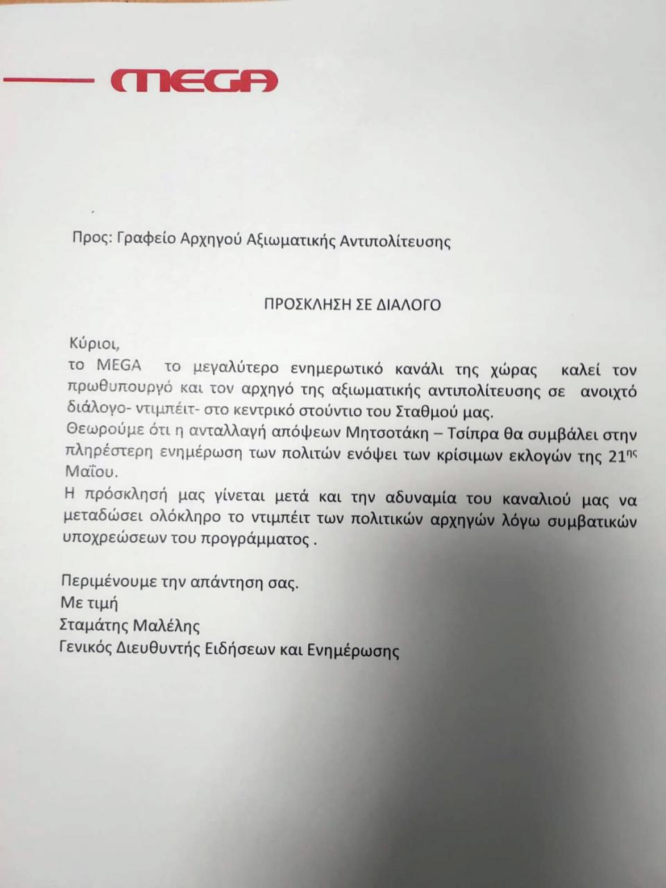 Θετικά ανταποκρίθηκε ο ΣΥΡΙΖΑ- Προοδευτική Συμμαχία στην πρόσκληση του τηλεοπτικού σταθμού Mega . Η Εκπρόσωπος Τύπου του ΣΥΡΙΖΑ Προοδευτική Συμμαχία, Πόπη Τσαπανίδου γνωστοποίησε πως «με χαρά αποδεχόμαστε την πρόσκληση του τηλεοπτικού σταθμού MEGA σε ανοιχτό διάλογο ντιμπέιτ μεταξύ του Αλέξη Τσίπρα και του Κυριάκου Μητσοτάκη και πως είναι στη διάθεση του καναλιού, όποια μέρα επιθυμεί τροποποιώντας το πρόγραμμα του προέδρου για να γίνει ο δημόσιος διάλογος που θα συμβάλει στην ενημέρωση των πολιτών».