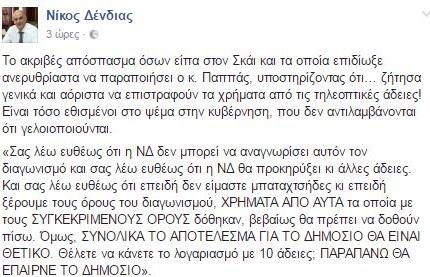 «Την διαφορά ανάμεσα στο θα επιστραφούν όλα τα χρήματα και στο θα επιστραφούν αναλογικά κάποια από τα χρήματα, όταν δοθούν και άλλες τηλεοπτικές άδειες, όπως στην πραγματικότητα δήλωσα στην τηλεοπτική εκπομπή του Σκάι, μόνον οι κουτοπόνηροι προπαγανδιστές του ΣΥΡΙΖΑ και της Κυβέρνησης παριστάνουν ότι δεν την καταλαβαίνουν. Πρόκειται για ζήτημα στοιχειώδους λογικής και εντιμότητας του Κράτους» αναφέρει χαρακτηριστικά στην δήλωση του ο Νίκος Δένδιας.