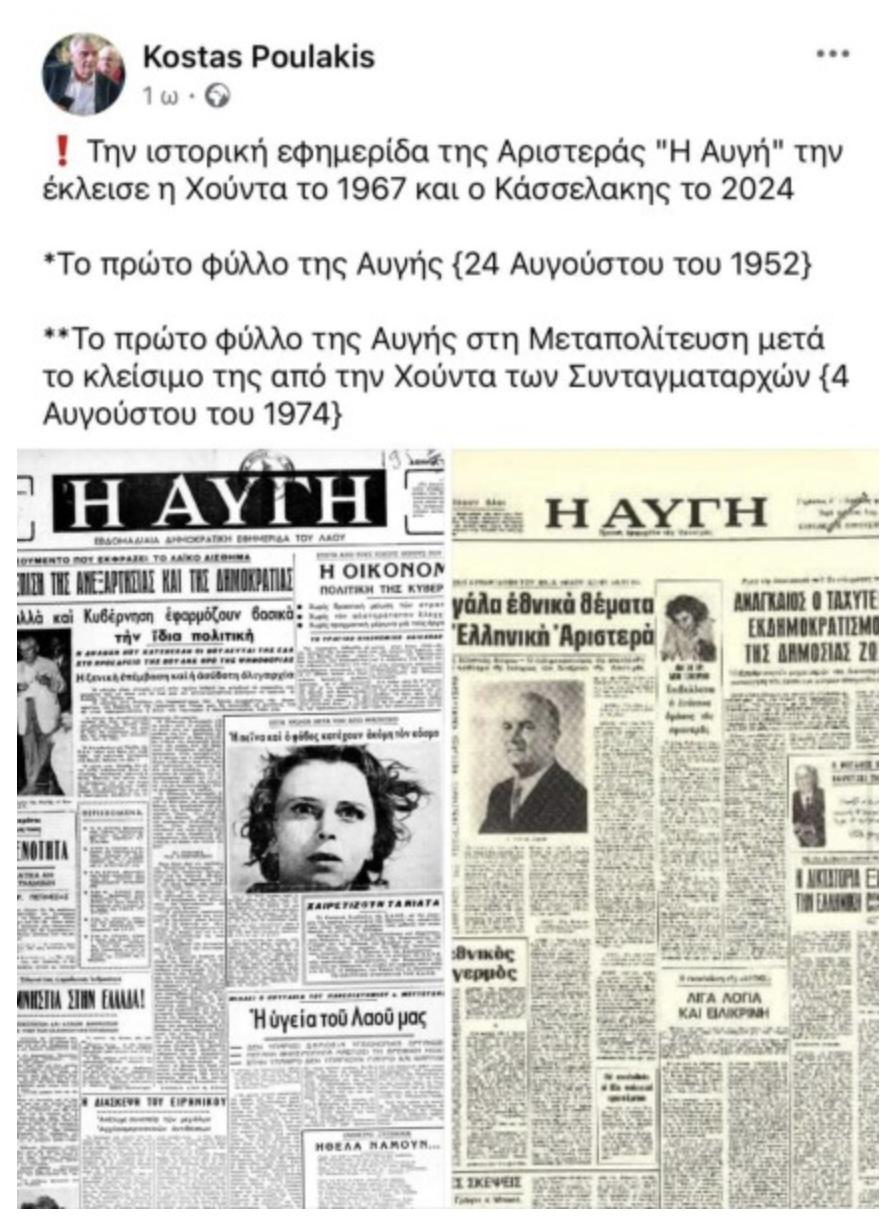 Ιδιαίτερα έντονη ήταν η αντίδραση του πρώην γενικού γραμματέα του υπουργείου Εσωτερικών επί κυβέρνησης ΣΥΡΙΖΑ, Κώστα Πουλάκη. Σε ανάρτησή του στα μέσα κοινωνικής δικτύωσης, ο κ. Πουλάκης συνέκρινε την απόφαση του κ. Κασσελάκη με την απόφαση της Χούντας των Συνταγματαρχών το 1967, αναφέροντας χαρακτηριστικά: «Την ιστορική εφημερίδα της Αριστεράς «Η Αυγή» την έκλεισε η Χούντα το 1967 και ο Κασσελάκης το 2024».