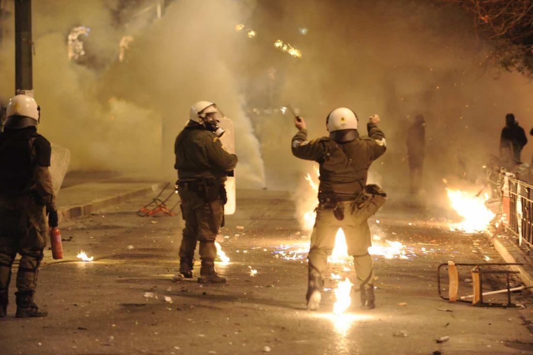 "Με την απόλυτη ανοχή των αρχών του μνημονιακού καθεστώτος Τσίπρα-Καμμένου, οι παρακρατικοί κοπρίτες της αριστεράς καίνε αυτή την στιγμή την Αθήνα ανενόχλητοι. Η αστυνομία παίζει τον ρόλο του τηλεθεατή και παρακολουθεί μία δράκα από αφελληνισμένα παρακρατικά στοιχεία και λαθρομετανάστες να καταστρέφουν και να βιαιοπραγούν", αναφέρει με ανακοίνωση της η Χρυσή Αυγή .