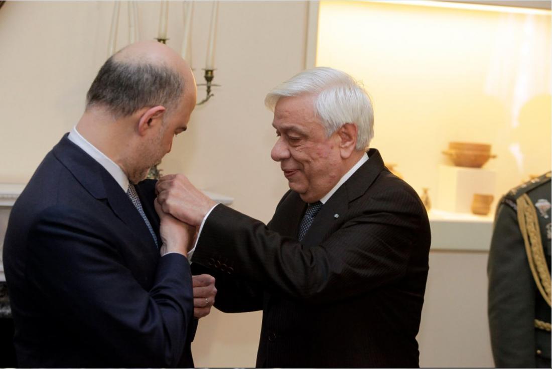Στην τελετή Παρασημοφόρησης στο Προεδρικό Μέγαρο παρέστησαν επίσης, ο Επίτροπος Μετανάστευσης, Εσωτερικών Υποθέσεων και Ιθαγένειας της ΕΕ κ. Δημήτρης Αβραμόπουλος, ο Επικεφαλής της Αντιπροσωπείας της Ευρωπαϊκής Επιτροπής στην Ελλάδα κ. Πάνος Καρβούνης και ο Γάλλος Πρέσβης στην Αθήνα κ. Κριστόφ Σαντεπί, καθώς και η σύζυγος του Πιέρ Μοσκοβισί κ. Aν Μισέλ Μπαστερί.