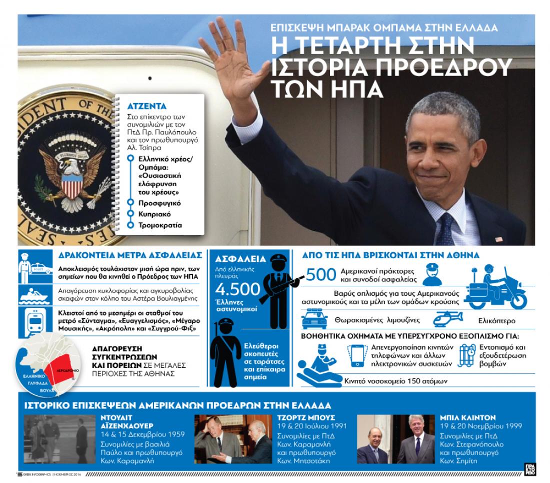 Το γράφημα αποτυπώνει τα μέτρα ασφαλείας που έχουν ληφθεί για την επίσκεψη του Αμερικανού Προέδρου, Μπαράκ Ομπάμα τα βασικά θέματα που θα συζητήσει στην Αθήνα καθώς και τις παλαιότερες επισκέψεις Αμερικανών Προέδρων στην Ελλάδα.