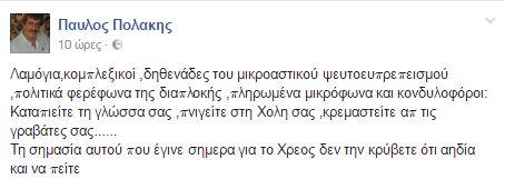«Λαμόγια, κομπλεξικοί, δηθενάδες του μικροαστικού ψευτοευπρεπεισμού, πολιτικά φερέφωνα της διαπλοκής, πληρωμένα μικρόφωνα και κονδυλοφόροι: Καταπιείτε τη γλώσσα σας, πνιγείτε στη Χολη σας, κρεμαστείτε απ τις γραβάτες σας...... Τη σημασία αυτού που έγινε σημερα για το Χρεος δεν την κρύβετε ότι αηδία και να πείτε».
