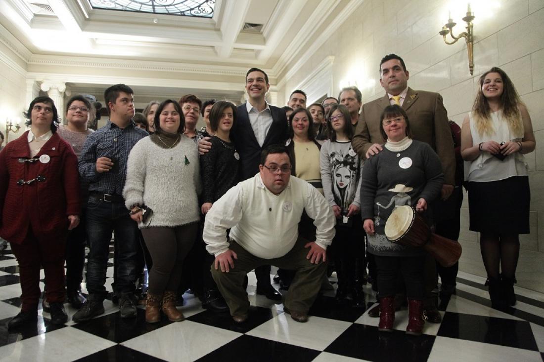 Οι πρώτοι που πέρασαν το κατώφλι του πρωθυπουργικού Μεγάρου ήταν τα παιδιά και οι συνοδοί τους, από το Σύλλογο Συνδρόμου Down Ελλάδος, και ο πρωθυπουργός Αλέξης Τσίπρας τους υποσχέθηκε ότι θα τους επισκεφθεί και στην έδρα του Συλλόγου, που είναι στη Θεσσαλονίκη. Ένα από τα παιδιά όμως, φορούσε κονκάρδα του ΠΑΟΚ, γεγονός που έδωσε την αφορμή να ξεκινήσει αθλητική συζήτηση! Ο πρωθυπουργός δώρισε στα παιδιά τον τεχνολογικό εξοπλισμό για να μπορούν να βλέπουν κινηματογράφο στα γραφεία του Συλλόγου, πράγμα που τα χαροποίησε ιδιαίτερα.