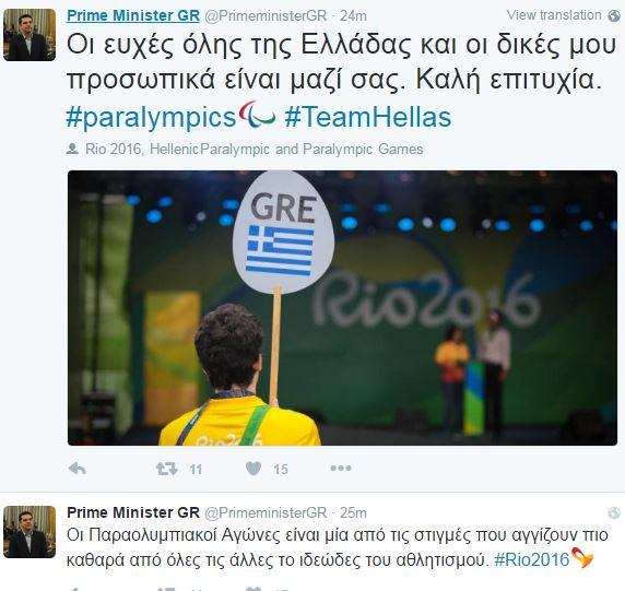 Ευχές Τσίπρα στους παραολυμπιονίκες μας μέσω Twitter