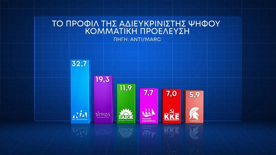 Στην εκτίμηση του αποτελέσματος, η Νέα Δημοκρατία συγκεντρώνει ποσοστό 33,4% (36,1% με 30,7%), ενώ ακολουθούν ο ΣΥΡΙΖΑ με 16,5% (18,6% με 14,4%), το ΠΑΣΟΚ με 11,8% (13,6% με 10%), η Ελληνική Λύση με 8,8% (από 10,4% με 7,2%), το ΚΚΕ με 7,6% (9,1% με 6,1%), η Πλεύση Ελευθερίας με 4,6% (5,8% με 3,4%), η Νίκη με 3,6% (4,7% με 2,5%), το ΜέΡΑ25 με 3% (4% με 2%), η Νέα Αριστερά με 2,5% (1,6% με 3,4%).