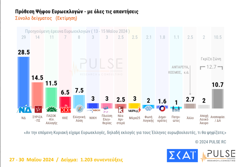 Δημοσκόπηση ΣΚΑΪ/Pulse: Στις 15.5 μονάδες η διαφορά της ΝΔ από τον ΣΥΡΙΖΑ - Τα σενάρια κατανομής των εδρών