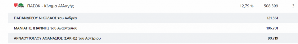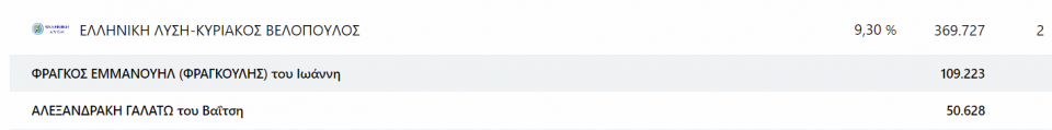 Σύμφωνα με την κατανομή των ποσοστών στο 100% της ενσωμάτωσης των ψήφων η ΝΔ καταλαμβάνει 7 έδρες, ο ΣΥΡΙΖΑ 4 έδρες, το ΠΑΣΟΚ 3 έδρες, η Ελληνική Λύση παίρνει 2 έδρες όσες και το ΚΚΕ, ενώ από μια έδρα παίρνουν Νίκη, Πλεύση Ελευθερίας και Φωνή Λογικής.