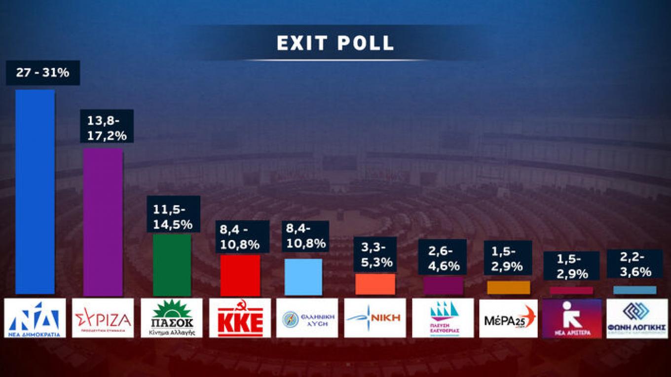 Σύμφωνα με το τελικό exit poll, η Νέα Δημοκρατία προηγείται με ποσοστό 28-32%, ενώ ο ΣΥΡΙΖΑ ακολουθεί με ποσοστό 15,2%-18,2%.