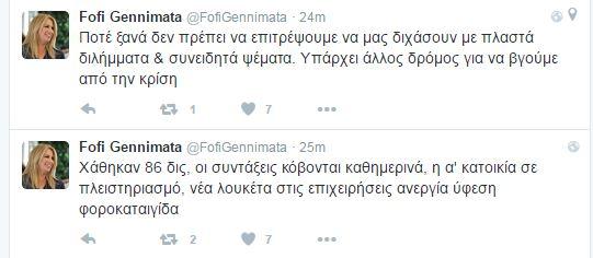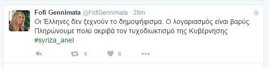 «Οι Έλληνες δεν ξεχνούν το δημοψήφισμα. Ο λογαριασμός είναι βαρύς. Πληρώνουμε πολύ ακριβά τον τυχοδιωκτισμό της Κυβέρνησης» σχολίασε με το πρώτο twett η πρόεδρος του ΠΑΣΟΚ στο λογαριασμό της.