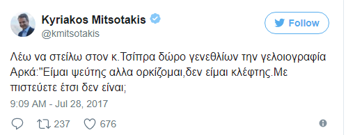 Με αφορμή τη δήλωση του κ. Τσίπρασε συνέντευξή του στην εφημερίδα The Guardian όπου και είχε δηλώσει μεταξύ άλλων πως κανένας στο δρόμο δεν θα κατηγορήσει τα μέλη της κυβέρνησης ότι είναι κλέφτες, ο κ. Μητσοτάκης χρησιμοποιήσε μία γελοιογραφία του Αγια να ευχηθεί: