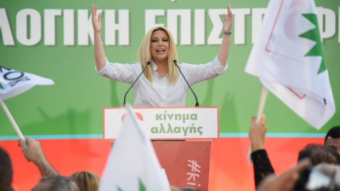 Σύμφωνα με την Φώφη Γεννηματά το Κίνημα Αλλαγής είναι δύναμη που θα αποτρέπει την κυριαρχία της ΝΔ και παράλληλα θα αποδυναμώσει τώρα, καθοριστικά τον ΣΥΡΙΖΑ. Κατηγόρησε τον Αλέξη Τσίπρα πως για τέσσερα χρόνια καλλιέργησε τον διχασμό κι έκανε παραχωρήσεις σε εθνικά θέματα και πως χρεοκόπησε με την Καραμανλική συνιστώσα και τον ακροδεξιό συνεταίρο του, το όνομα της Αριστεράς.