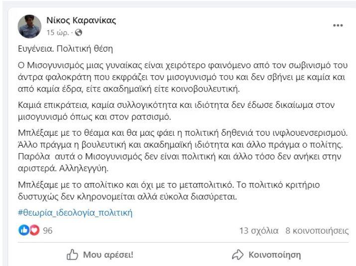 Αρχικά, ο Καρανίκας σε δηκτική ανάρτησή του, χωρίς να την κατονομάζει, άφησε αιχμές κατά της βουλευτή του ΣΥΡΙΖΑ, καθώς έκανε λόγο για «μισογυνισμό μιας γυναίκας», προσθέτοντας ότι «μπλέξαμε με το θέαμα και θα μας φάει η πολιτική δηθενιά του ινφουενσερισμού», ενώ κατέληξε γράφοντας ότι «το πολιτικό κριτήριο δυστυχώς δεν κληρονομείται, αλλά εύκολα διασύρεται».