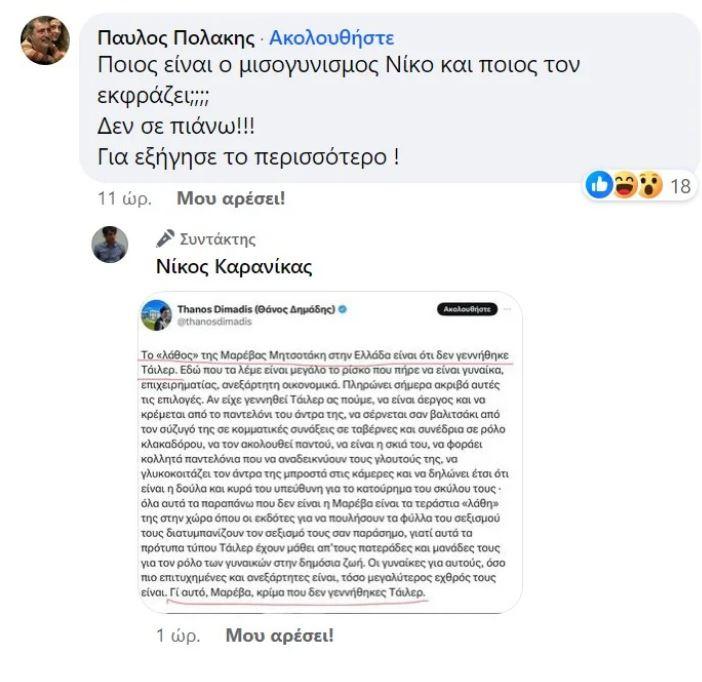Συγκεκριμένα, στην ανάρτηση Καρανίκα κατά της Ακρίτα απάντησε ο Παύλος Πολάκης, γράφοντας σε σχόλιό του: «Ποιος είναι ο μισογυνισμος Νίκο και ποιος τον εκφράζει;;;; Δεν σε πιάνω!!! Για εξήγησε το περισσότερο!».