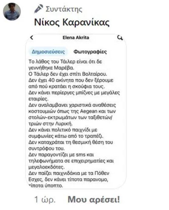 Ο Νίκος Καρανίκας απάντησε παραθέτοντας την ανάρτηση του δημοσιογράφου Θάνου Δημάδη - που αποτέλεσε αφορμή για την τοποθέτηση της Έλενας Ακρίτα - αλλά και την ανάρτηση της βουλευτού Επικρατείας του ΣΥΡΙΖΑ.