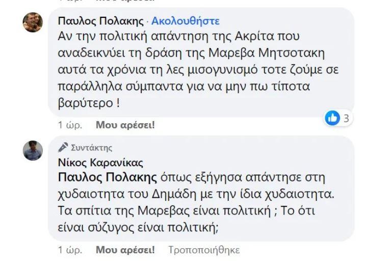 Μετά την τοποθέτηση αυτή του Νίκου Καρανίκα, ο κ. Πολάκης απάντησε εκ νέου γράφοντας «αν την πολιτική απάντηση της Ακρίτα που αναδεικνύει τη δράση της Μαρεβα Μητσοτακη αυτά τα χρόνια τη λες μισογυνισμό τοτε ζούμε σε παράλληλα σύμπαντα για να μην πω τίποτα βαρύτερο!».