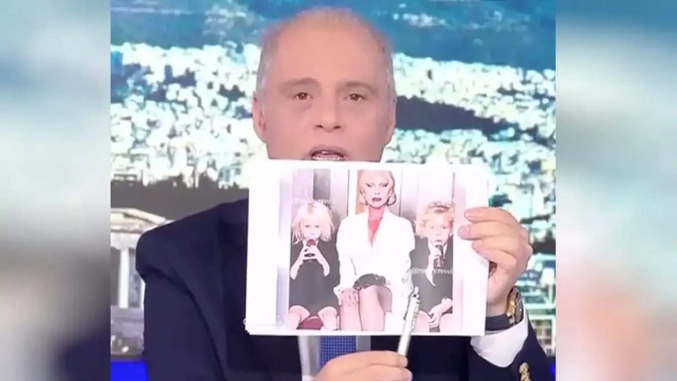 «Δείτε εδώ, τη βλέπετε αυτή την κυρία. Δείτε τα παιδιά δεξιά και αριστερά τι πίνουν; Κόκκινο χρώμα», ανέφερε χαρακτηριστικά, δείχνοντας τη φωτογραφία στον τηλεοπτικό αέρα.