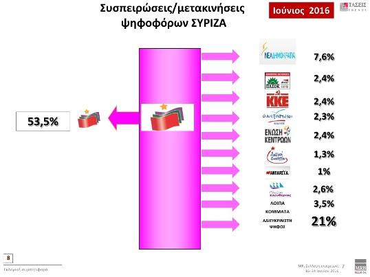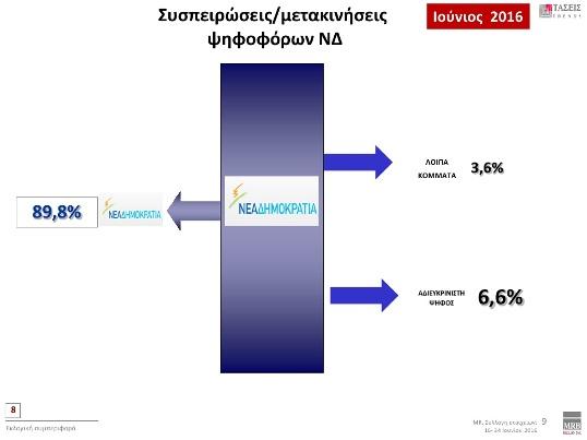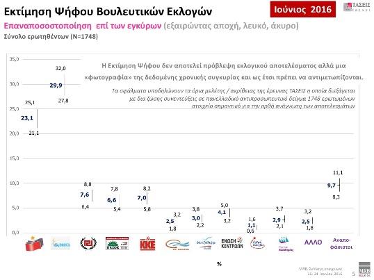 Όπως αναφέρει η real.gr στην πρόθεση ψήφου και στα στοιχεία που καταγράφηκαν στις τάσεις Ιουνίου 2016 (16-24/06) της MRB η ΝΔ προηγείται με ποσοστό 5,9% έναντι του ΣΥΡΙΖΑ. Συγκεκριμένα, καταγράφει ποσοστό 26,1% με τον ΣΥΡΙΖΑ να ακολουθεί με 20,2%. Ακολουθούν: Χρυσή Αυγή 6,6%, ΚΚΕ 6,1%, Δημοκρατική Συμπαράταξη/ΠΑΣΟΚ/ΔΗΜΑΡ 5,8%, Ένωση Κεντρώων 3,6%, Ανεξάρτητοι Έλληνες 2,6%, Πλεύση Ελευθερίας 2,5%, «Το Ποτάμι» με 2,2%, Λαϊκή Ενότητα 1,0%,. «Άλλο Κόμμα» επέλεξε το 2,2% των ερωτηθέντων, ενώ το ποσοστό της «Αδιευκρίνιστης Ψήφου» αγγίζει το 21,1%. Το ποσοστό της «Αδιευκρίνιστης Ψήφου» αναλύεται ως εξής: 8,5% Αναποφάσιστοι και 12,6% Αποχή (7%), Άκυρο (3,3%) και Λευκό (2,3%).