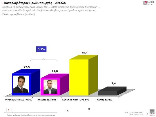 Στο ερώτημα για τον κατάλληλο πρωθυπουργό ο Αλέξης Τσίπρας συγκεντρώνει το 21,8% των ερωτηθέντων και ο επικεφαλής της ΝΔ και πρόεδρος της αξιωματικής αντιπολίτευσης το 27,5%. «Κανένας από τους δύο» απαντά το 45,4%.