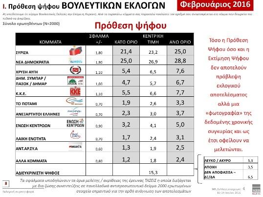 Στις τάσεις της MRB τον Φεβρουάριο του 2016 η ΝΔ προηγείτο με ποσοστό 3,7% έναντι του ΣΥΡΙΖΑ. Δείτε τη σχετική κάρτα στην πανελλαδική έρευνα που είχε γίνει το διάστημα (04-11/02)