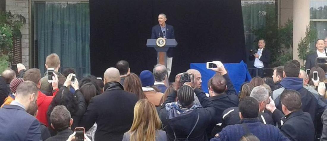 Ο πρόεδρος Ομπάμα ευχαρίστησε τους εργαζομένους της πρεσβείας των ΗΠΑ στην Αθήνα και με τη σύντομη ομιλία του κατάφερε να τους εμπνεύσει και να τους ευχαριστήσει για την πολύτιμη συνεισφορά τους. Μετά την πεντάλεπτη ομιλία του, ο Πρόεδρος των ΗΠΑ έσφιξε το χέρι όλων των υπαλλήλων, συνομίλησε μαζί τους και έβγαλε και φωτογραφίες με τα παιδιά τους.