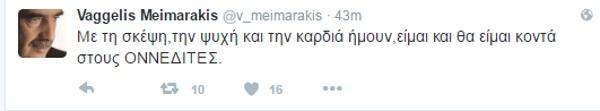 O Βαγγέλης Μεϊμαράκης πάντως ως πρώην πρόεδρος της ΟΝΝΕΔ έστειλε το δικό του μήνυμα μέσω twitter. Έγραψεσχετικά: Με τη σκέψη, την ψυχή και την καρδιά ήμουν, είμαι και θα είμαι κοντά στους ΟΝΝΕΔΙΤΕΣ.