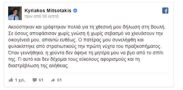 Επίσημη απάντηση στο Facebook έδωσε ο πρόεδρος της ΝΔ Κυριάκος Μητσοτάκης σε όλους όσοι τον επικρίνουν για τη χθεσινή αναφορά του στην Ολομέλεια ότι ο ίδιος ήταν «πολιτικός κρατούμενος από έξι μηνών από τη χούντα.