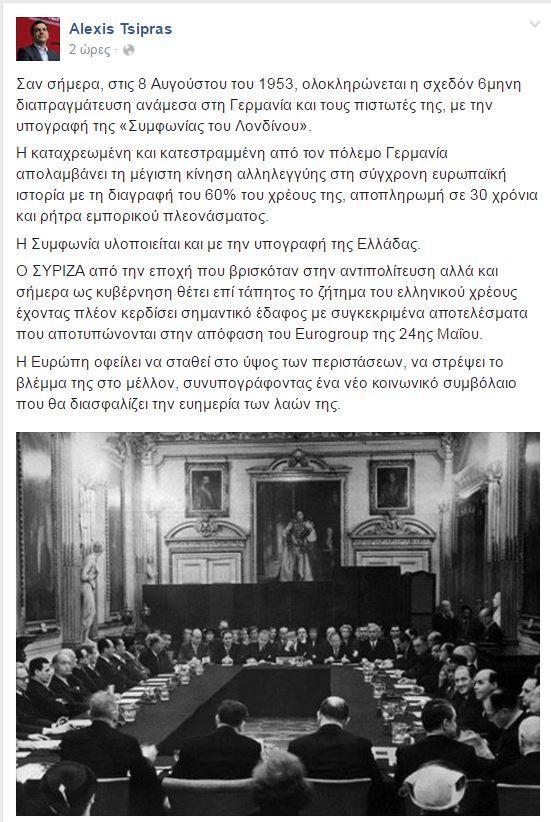 Ο Αλέξης Τσίπρας υπενθυμίζει ότι σαν σήμερα το 1953 ολοκληρώθηκε η διαπραγμάτευση ανάμεσα στη Γερμανία και τους πιστωτές της με την υπογραφή της Συμφωνίας του Λονδίνου και έτσι η καταχρεωμένη και κατεστραμμένη από τον πόλεμο Γερμανία απολαμβάνει τη μέγιστη κίνηση αλληλεγγύης με τη διαγραφή του 60% του χρέους της.