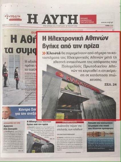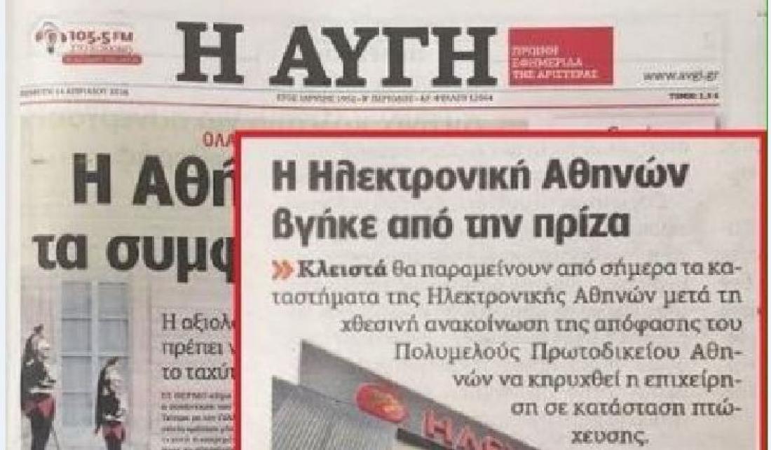 Το «κοινωνικό πρόσωπο» (βλέπε αναλγησία) και οι «αριστερές ευαισθησίες» της αποτυπώνονται στον τίτλο της «Αυγής»: «Η Ηλεκτρονική Αθηνών βγήκε από την πρίζα»!!!. Μικρή περιγραφή στα διαδικαστικά της υπόθεσης και καμία αναφορά στην τύχη των εργαζομένων. Αφορά και αυτούς που πίστεψαν στο κοινωνικό πρόσωπο του ΣΥΡΙΖΑ και τον ψήφισαν.