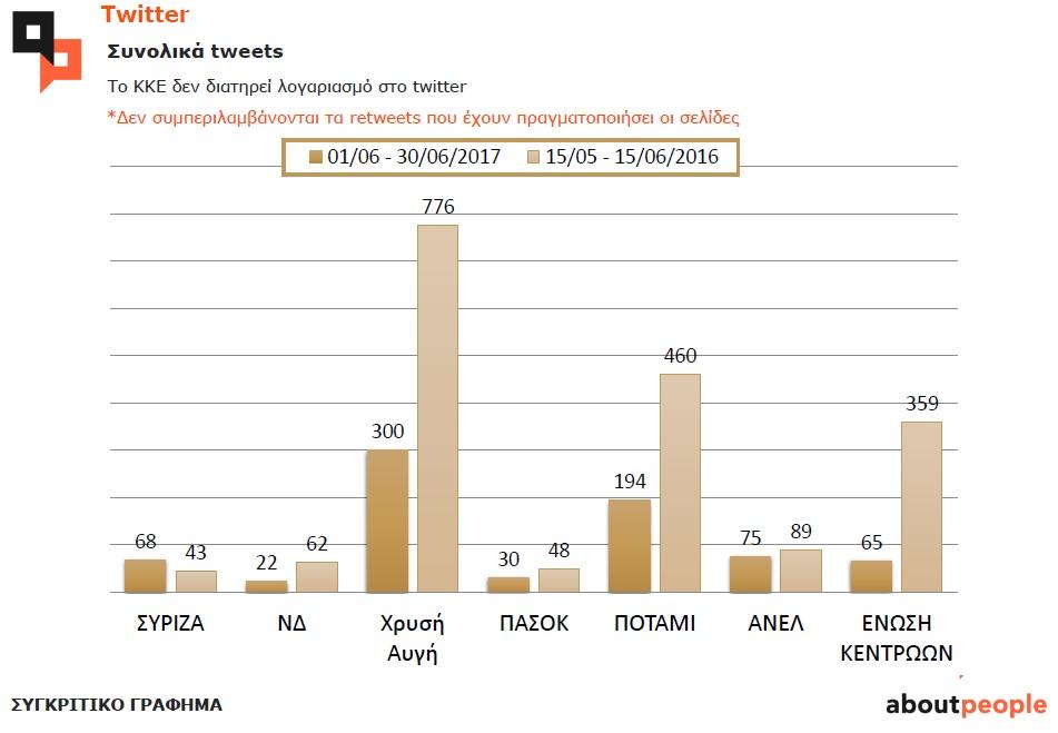 -Λιγότερα Tweets σε σχέση με πέρσι έχουν όλα τα κόμματα, εκτός από τον ΣΥΡΙΖΑ. Πιο ενεργοί εμφανίζονται η ΧΑ και το Ποτάμι
