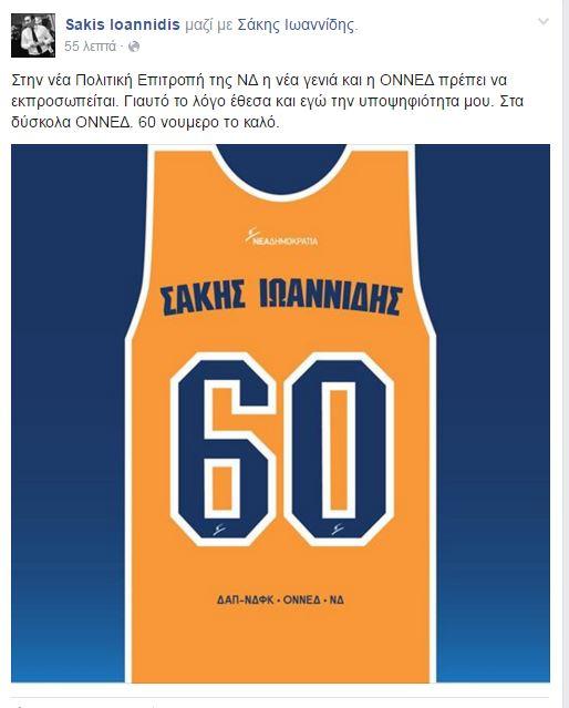 Με ανάρτηση στο facebook που έδειχνε μια φανέλα του μπάσκετ με τον αριθμό 60 και το όνομά του ο Σάκης Ιωαννίδης ανακοίνωσε την υποψηφιότητά του για την Πολιτική Επιτροπή της Νέας Δημοκρατίας.